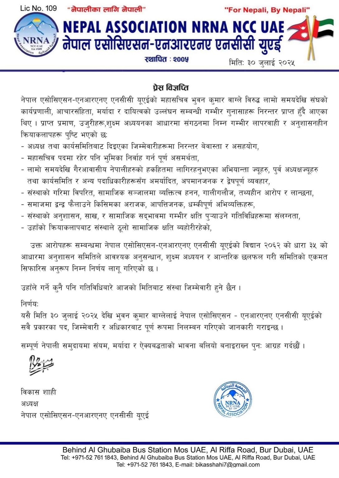 Dubai, UAE – July 30, 2025: The Nepal Association – NRNA NCC UAE has formally removed its General Secretary, Bhuwan Kumar Wagle, from all roles and responsibilities within the organization, effective immediately.