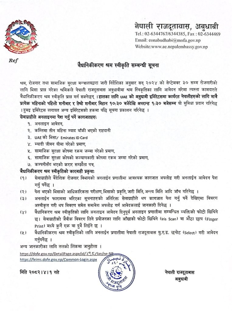 The Embassy of Nepal in Abu Dhabi has officially launched a biometric-based labor approval service for Nepali nationals who are currently working in Abu Dhabi and whose employment visas were issued before September 30, 2024. This initiative aims to streamline the labor approval process for Nepali migrant workers in compliance with the latest government regulations of Nepal.